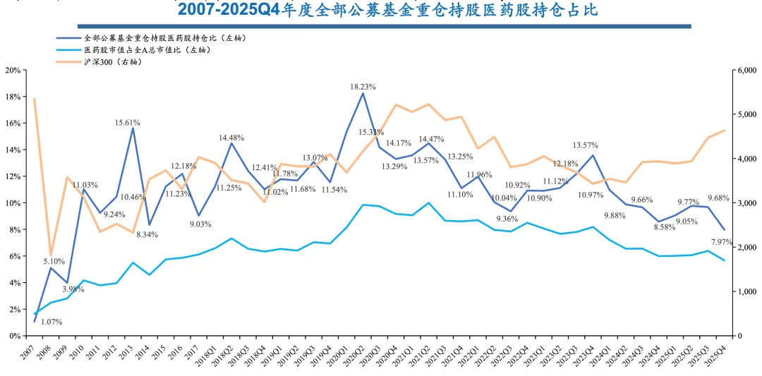 据华安证券,截止2025年四季报,全部公募基金重仓持股中,医药股持仓占比7.97%,跌至近15年来最低点。其中化学制药子行业持仓下降幅度最大(环比-0.57%),显示机构整体降仓意愿强烈。