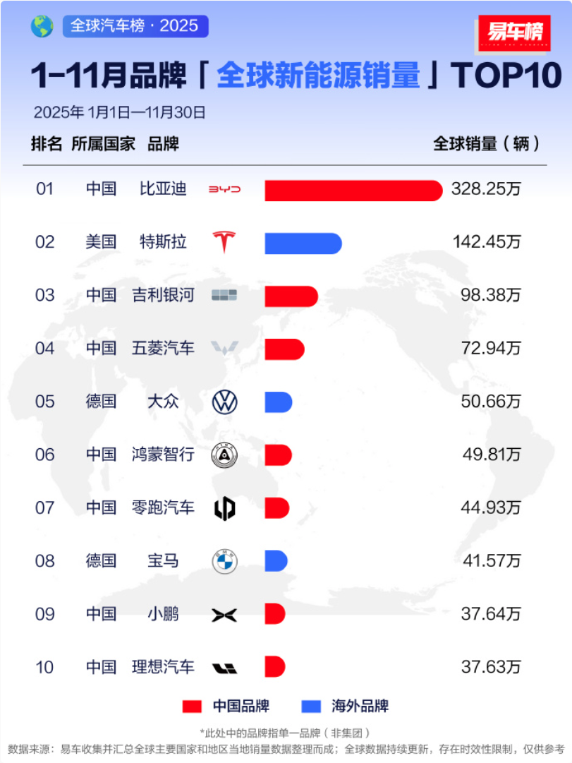 【CNMO科技消息】12月30日,根据汽车媒体整理的数据,2025年1月至11月,全球新能源品牌销量排行榜前十名中小散配资,中国品牌占据七席,展现出在新能源汽车领域的绝对主导力。比亚迪以328.25万辆的销量稳居榜首,超过第二名特斯拉两倍以上,突显中国在绿色出行领域的全面领先。